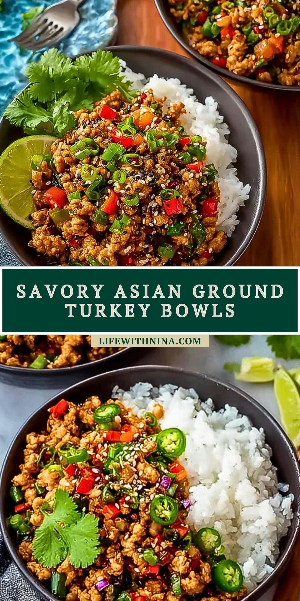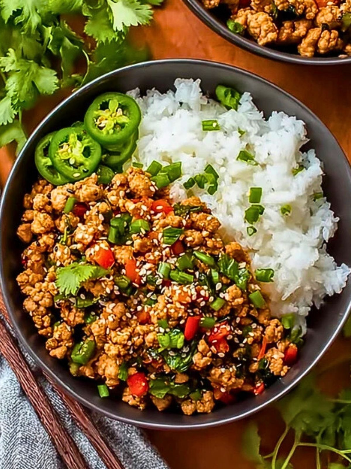 Spoon steamed jasmine rice into each bowl. Top with the savory turkey mixture and garnish with sesame seeds, extra green onions, and sliced jalapeños if you like heat.