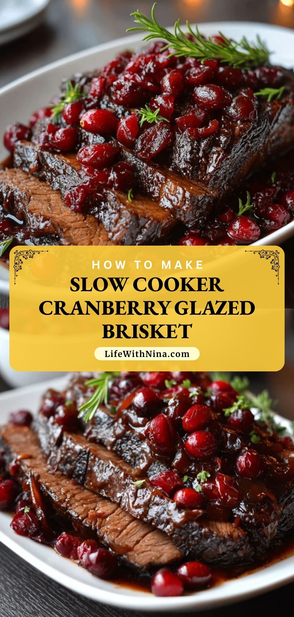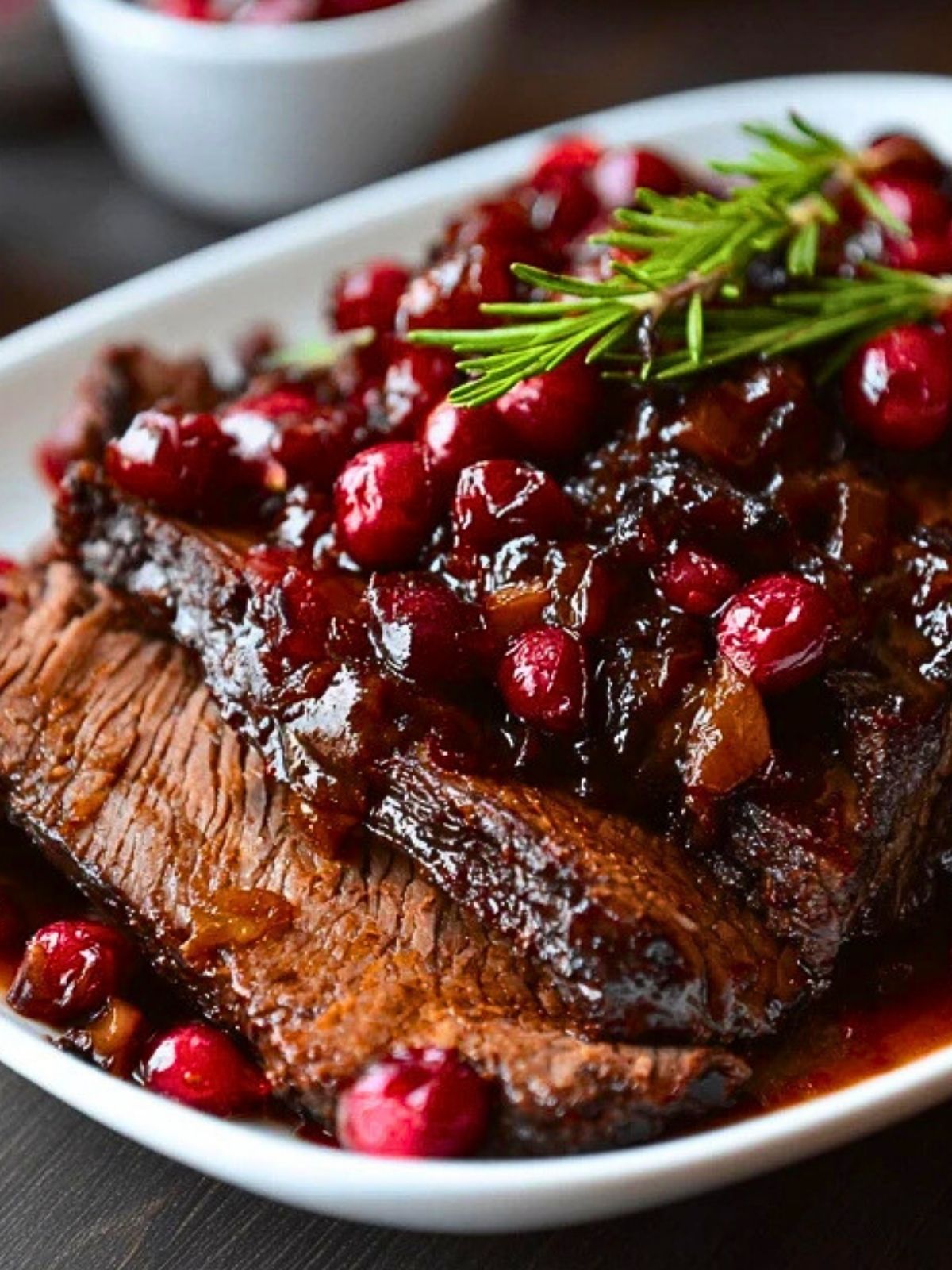 Once cooked, carefully transfer the brisket to a cutting board and let it rest for 10 minutes. Slice against the grain into thin pieces. Spoon the cranberry-onion glaze from the slow cooker over the brisket and garnish with extra rosemary sprigs if desired.