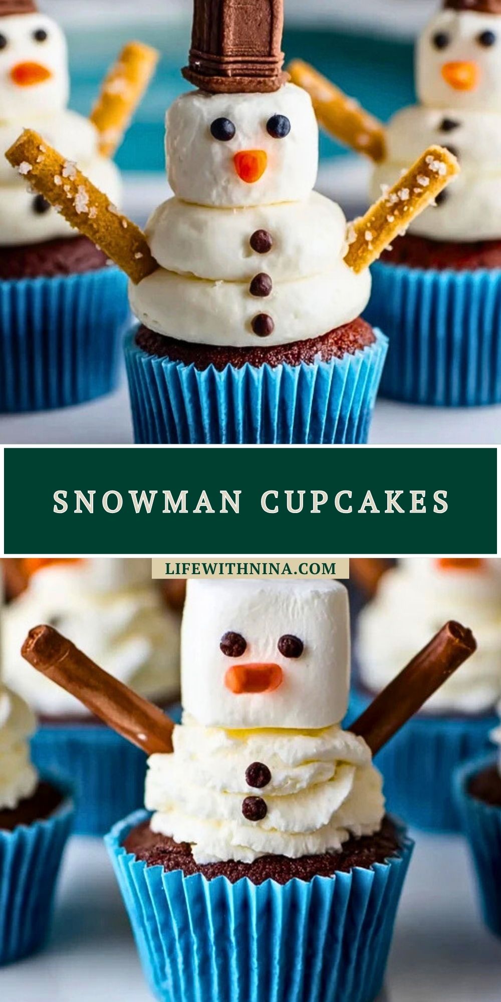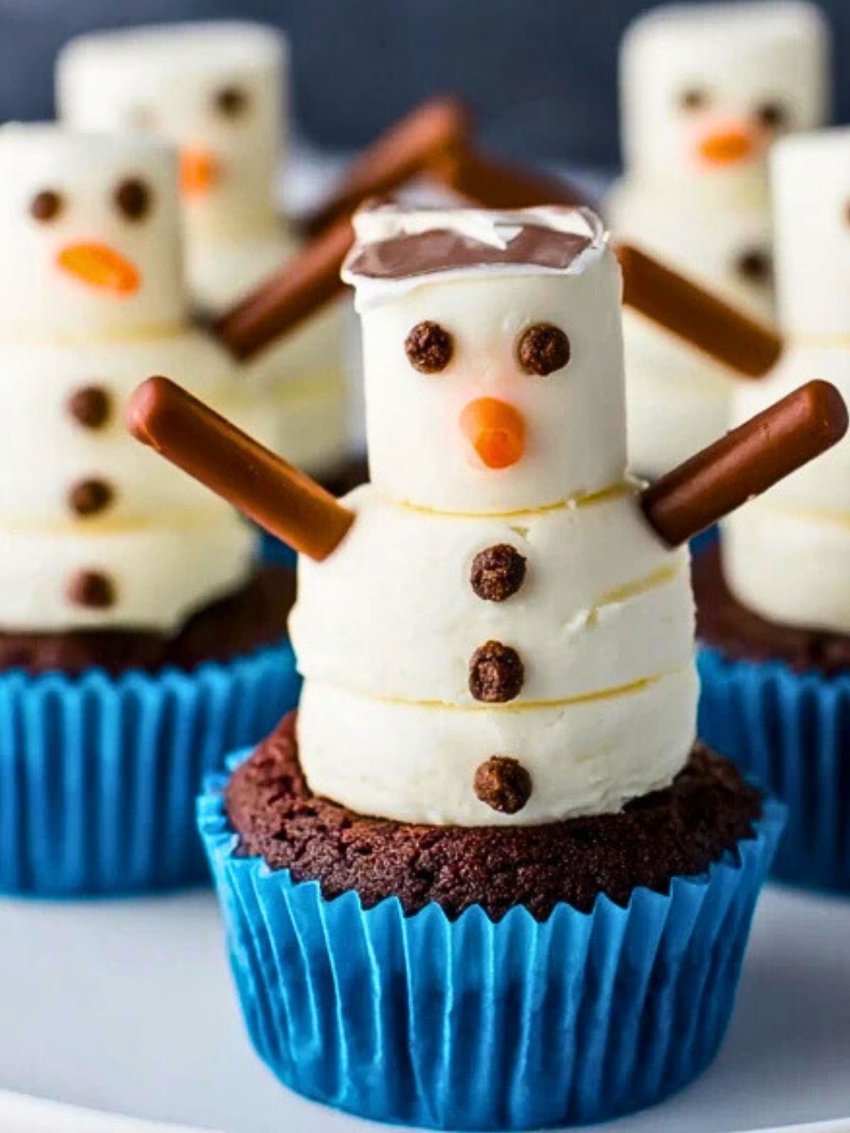 These Snowman Cupcakes are the perfect winter treat! Moist chocolate cupcakes are topped with sweet marshmallow snowmen, complete with candy faces and pretzel stick arms. They’re festive, fun, and easy to make—perfect for holiday parties or a cozy baking day with kids.