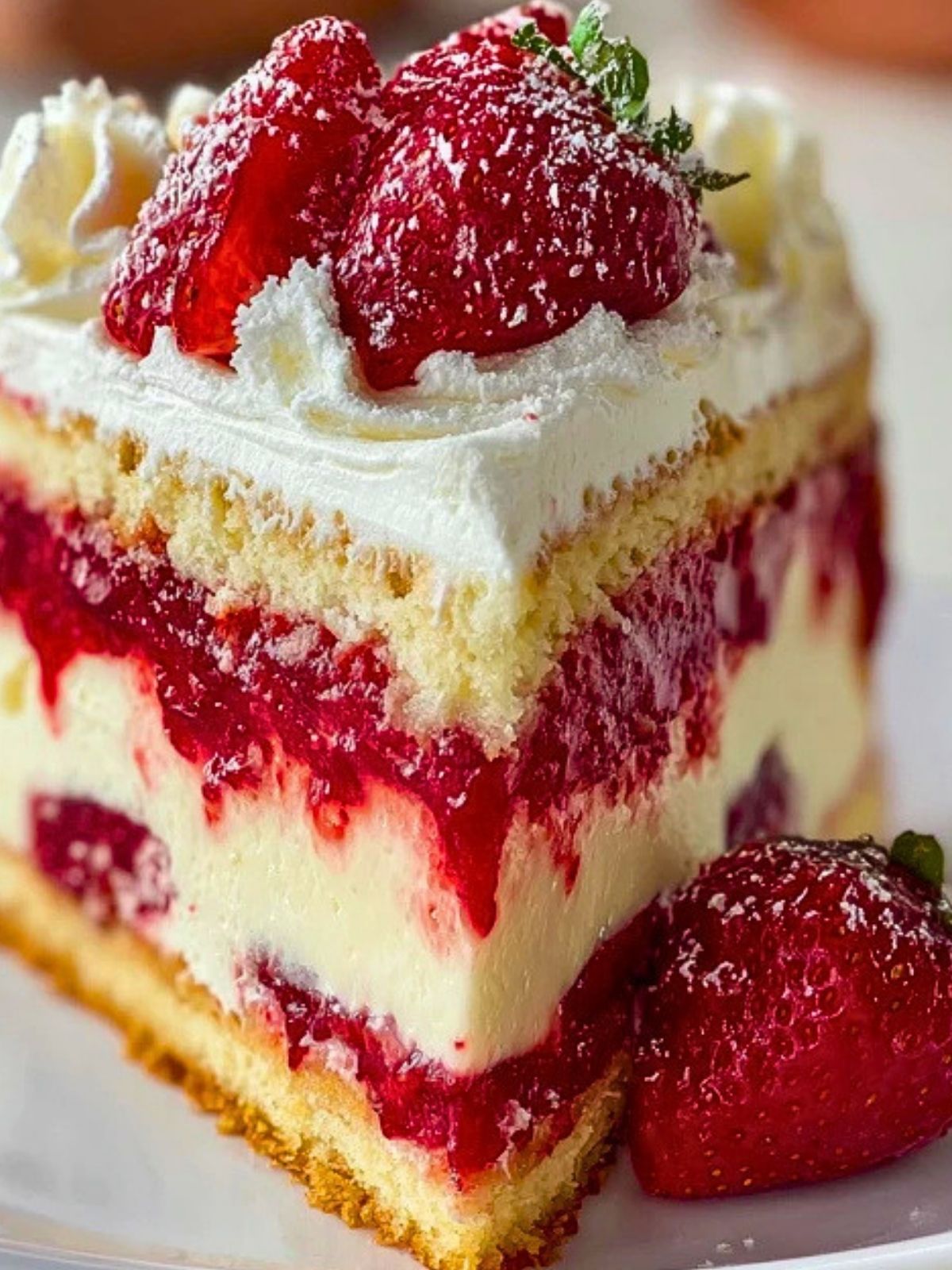 Serve this dessert chilled for best texture and flavor. It pairs beautifully with iced tea or a light rosé for adult gatherings. For storage, cover loosely with plastic wrap or a cake dome and refrigerate. It stays fresh up to 3 days—just note that the strawberries may release more juice over time, softening the cake further.