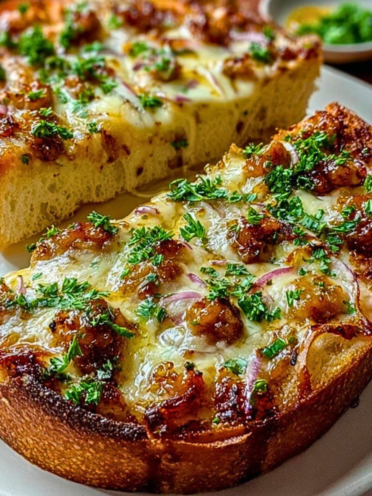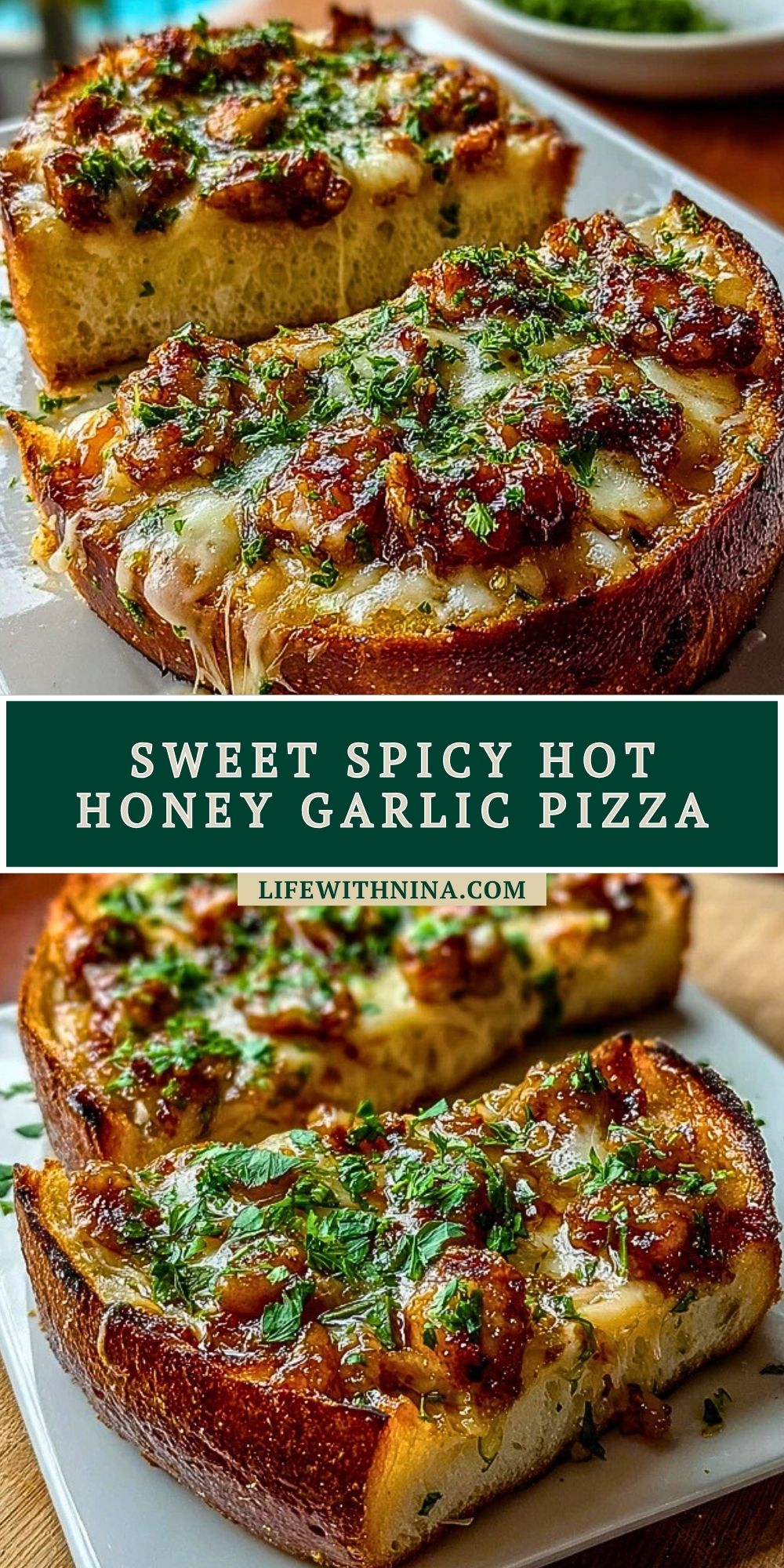 Imagine sinking your teeth into a golden slice of thick, crusty bread layered with gooey melted mozzarella, juicy sausage crumbles, slivers of red onion, and a drippy glaze of sweet and spicy hot honey garlic sauce. This pizza is not your average pie. It’s a flavor bomb that hits every note—sweet, savory, spicy, garlicky, and irresistibly cheesy.