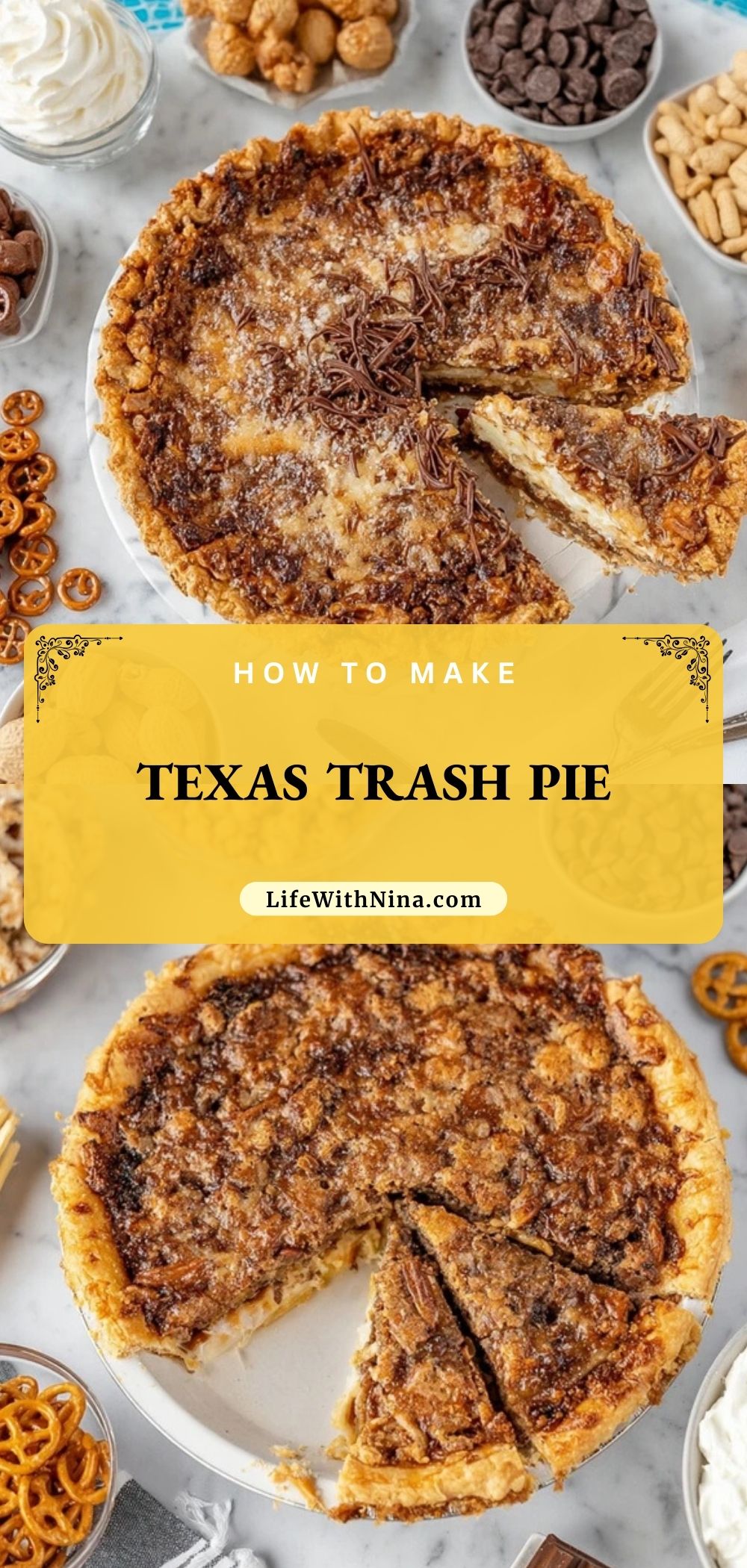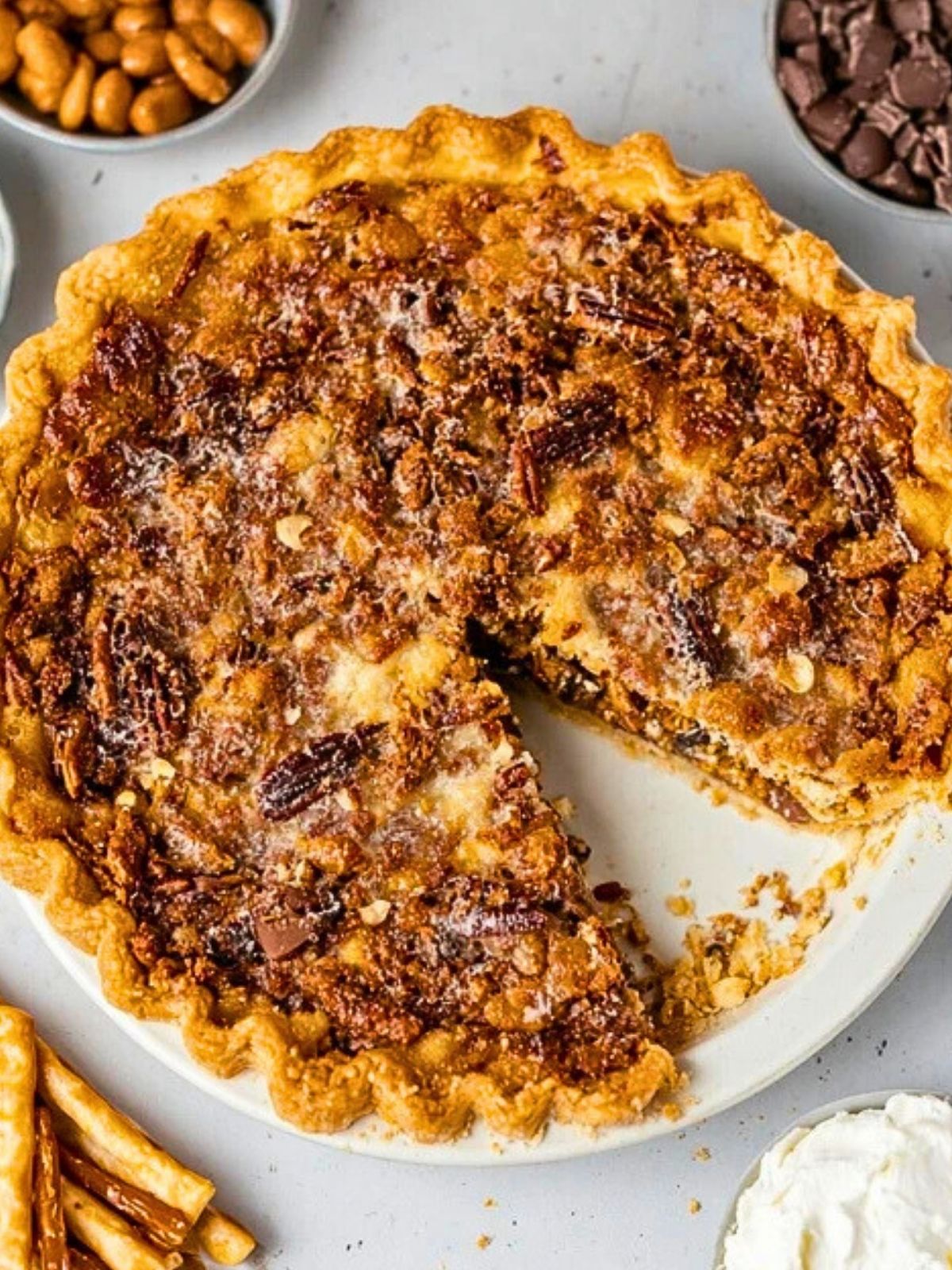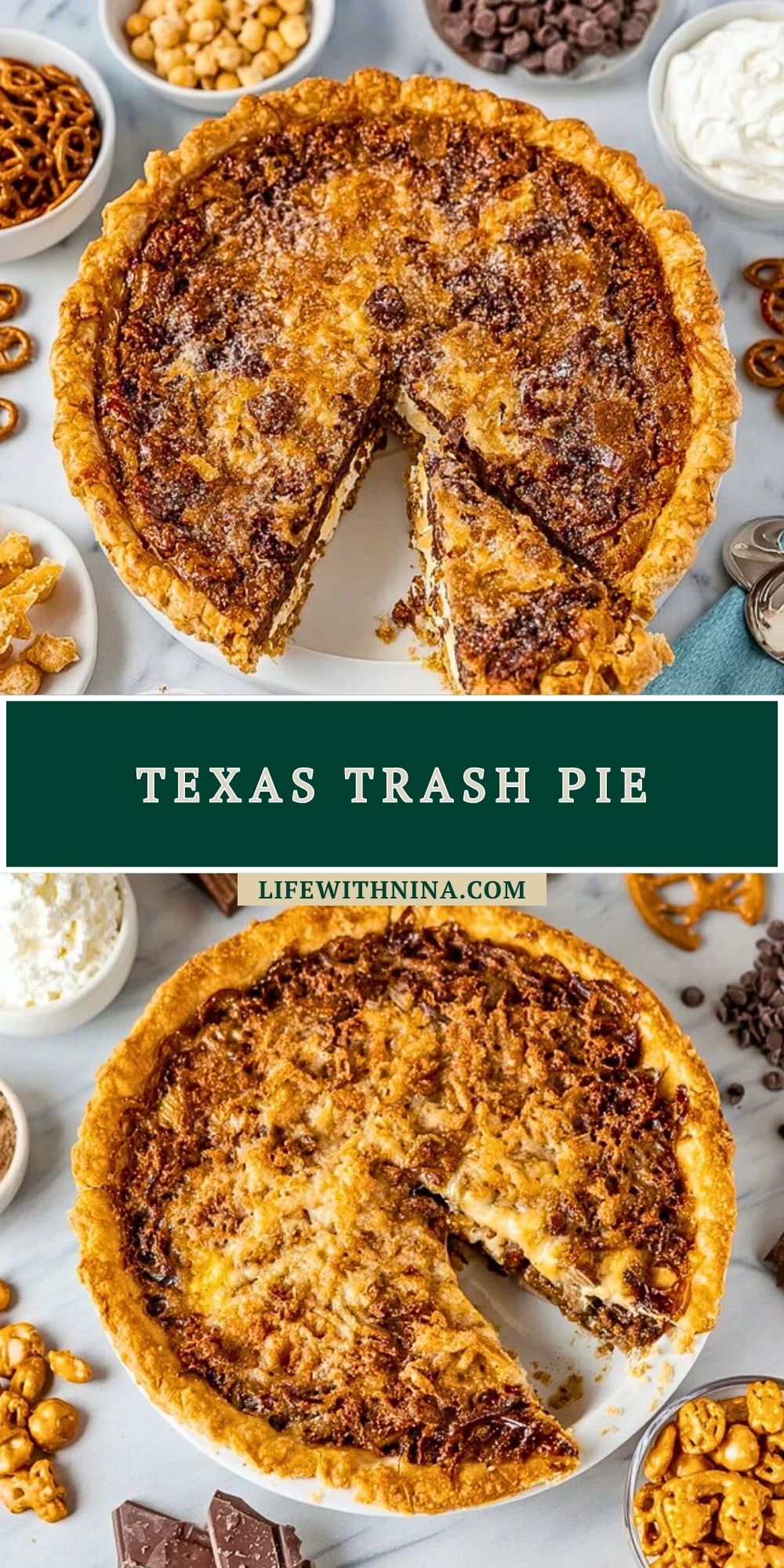 If you’re into salty-sweet desserts that break the rules in the most delicious way, you’re going to fall hard for Texas Trash Pie. This wildly indulgent dessert is everything but ordinary. Imagine a gooey, caramelized filling packed with chocolate chips, crushed pretzels, toasted pecans, shredded coconut, and buttery toffee bits—all baked into a golden, flaky pie crust. It’s like every great snack food got invited to the same party and decided to live happily ever after in pie form.