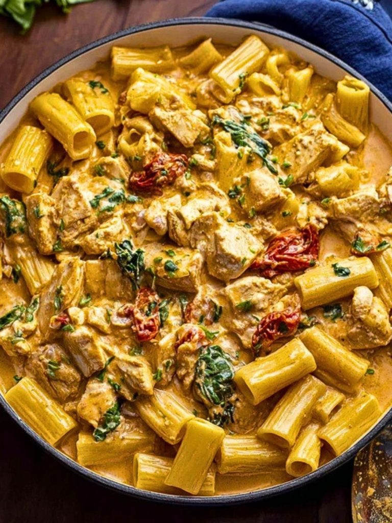 This creamy Tuscan Chicken Pasta features tender bites of seared chicken, sun-dried tomatoes, fresh spinach, and rigatoni, all tossed in a rich Parmesan cream sauce. It’s cozy, comforting, and perfect for a quick weeknight dinner or an elegant meal with friends.